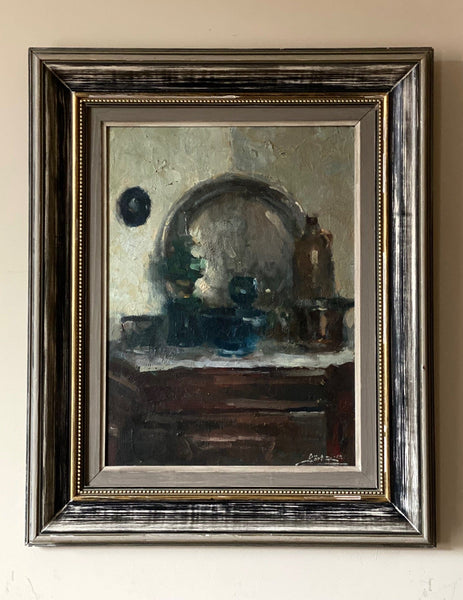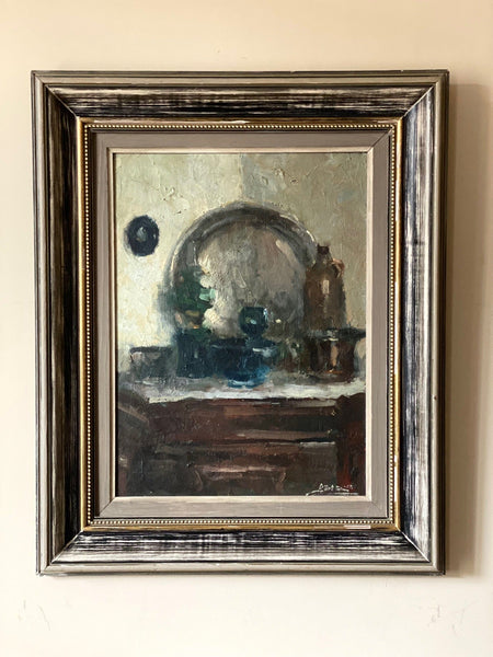oil on panel, signed and dated 1959, 56cm by 46cm with frame, painting 39cm by 29cm