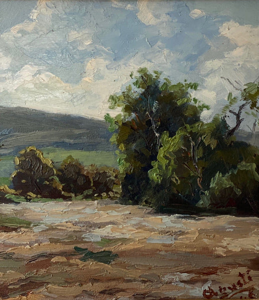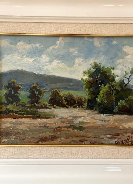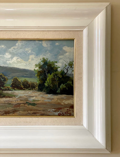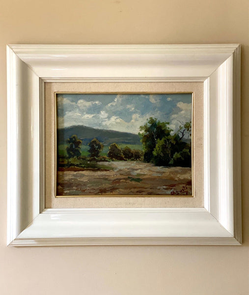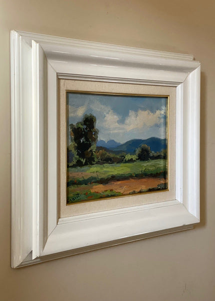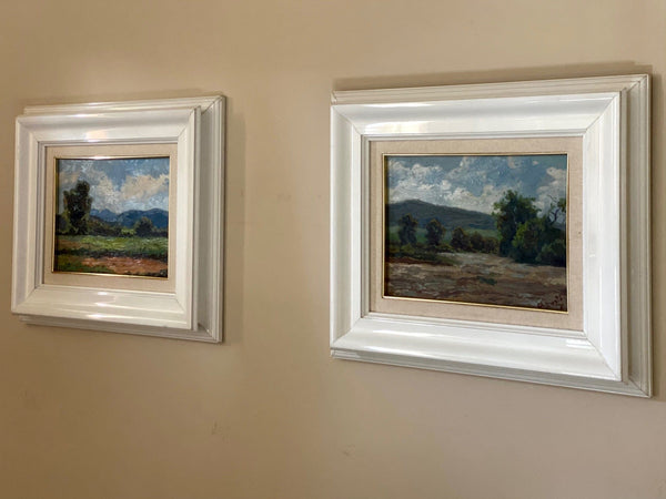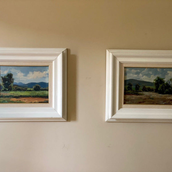 paintings of the countryside and harvest, with chunky patent white frames, paintings measure 22cm by 29cm, with frame 43cm by 49cm